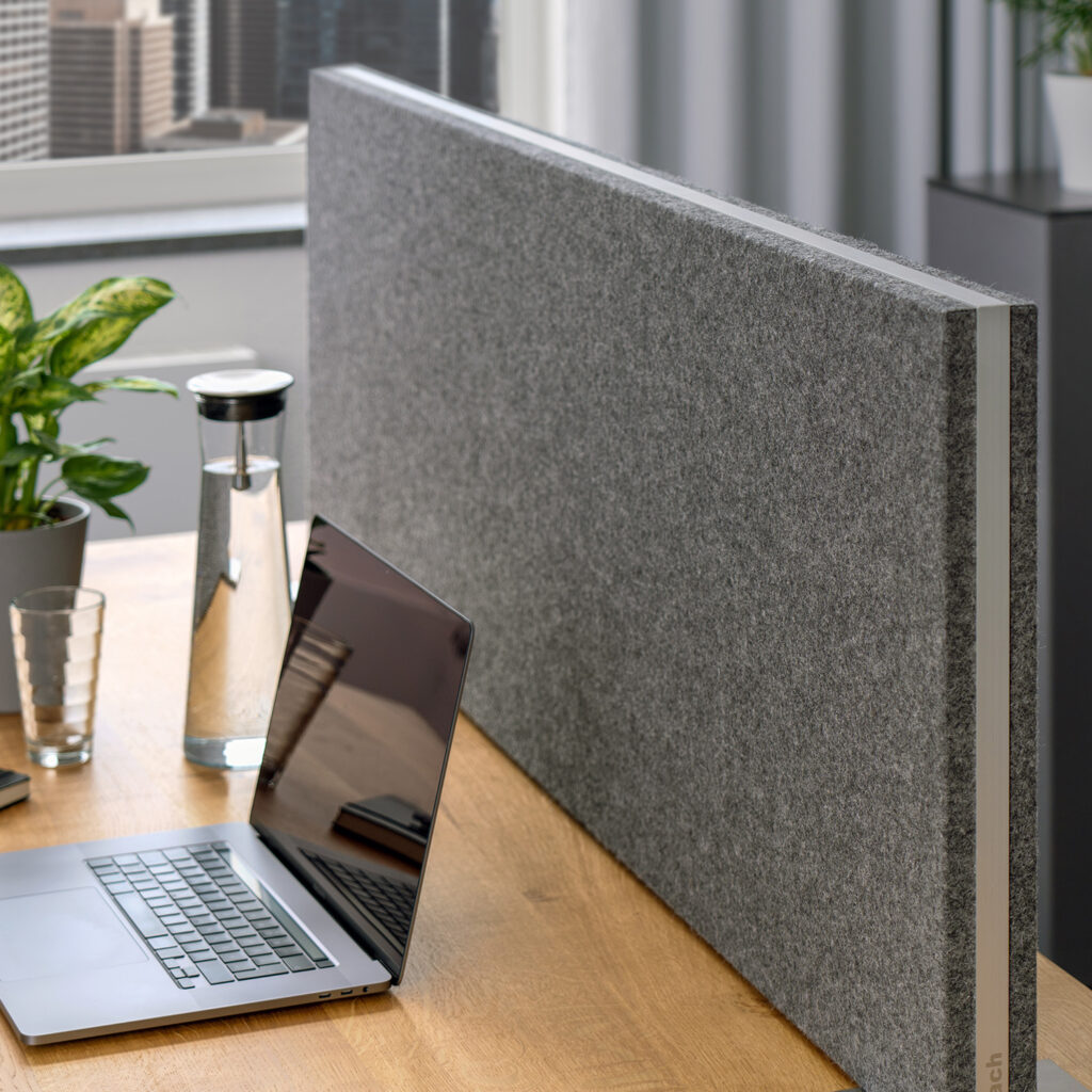 Der Aluminiumrahmen der Akustik-Trennwand Sonic-Duo ist bewusst so gestaltet, dass er nicht bis zum Rand reicht, sondern die Ecken mit weichem Designfilz abgerundet sind. Diese Bauweise schützt vor Beschädigungen und Kratzern bei versehentlichem Anstoßen. Erfahren Sie mit dem Sonic-Duo ein sicheres und sorgenfreies Arbeitsumfeld, das Funktionalität und Schutz vereint.