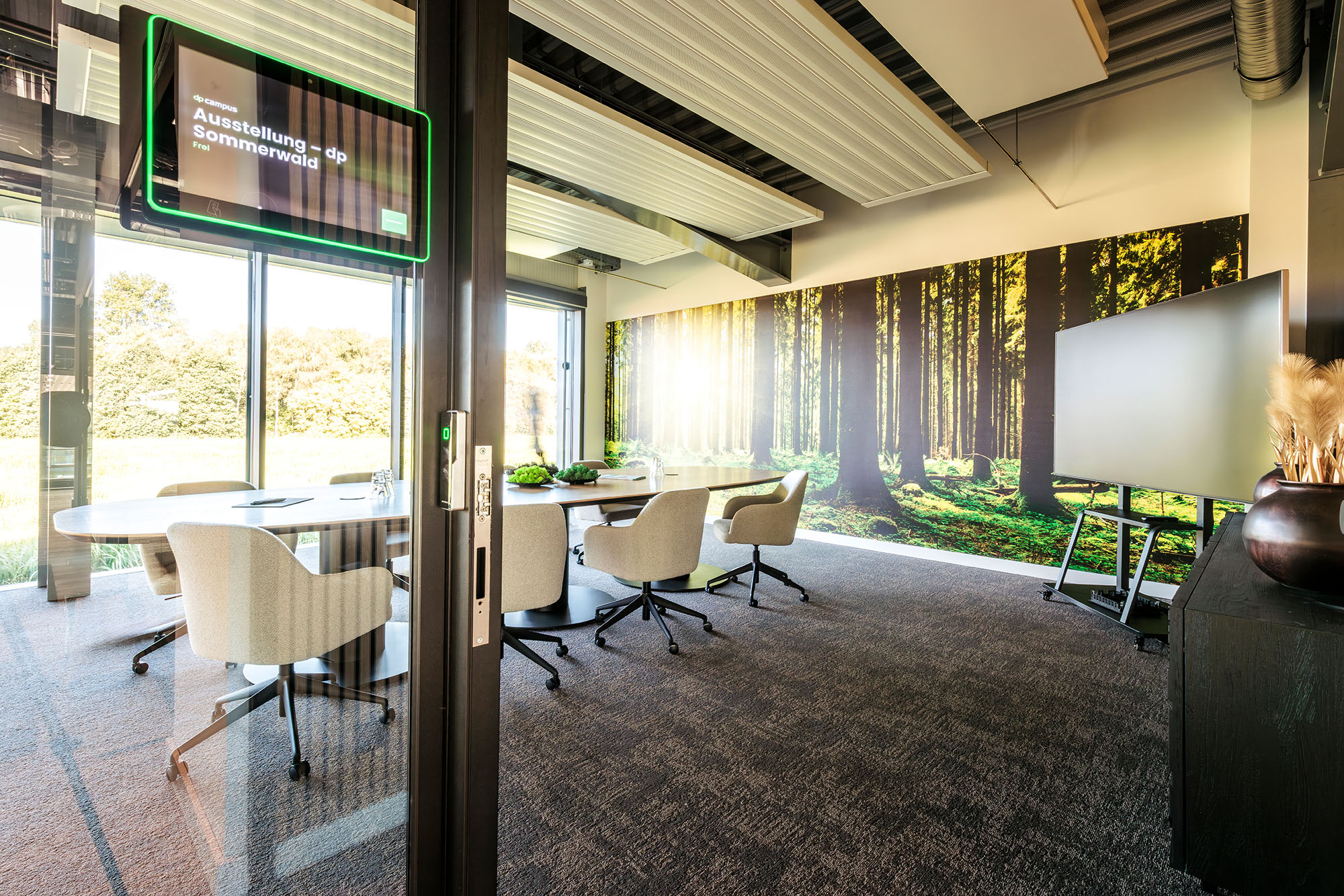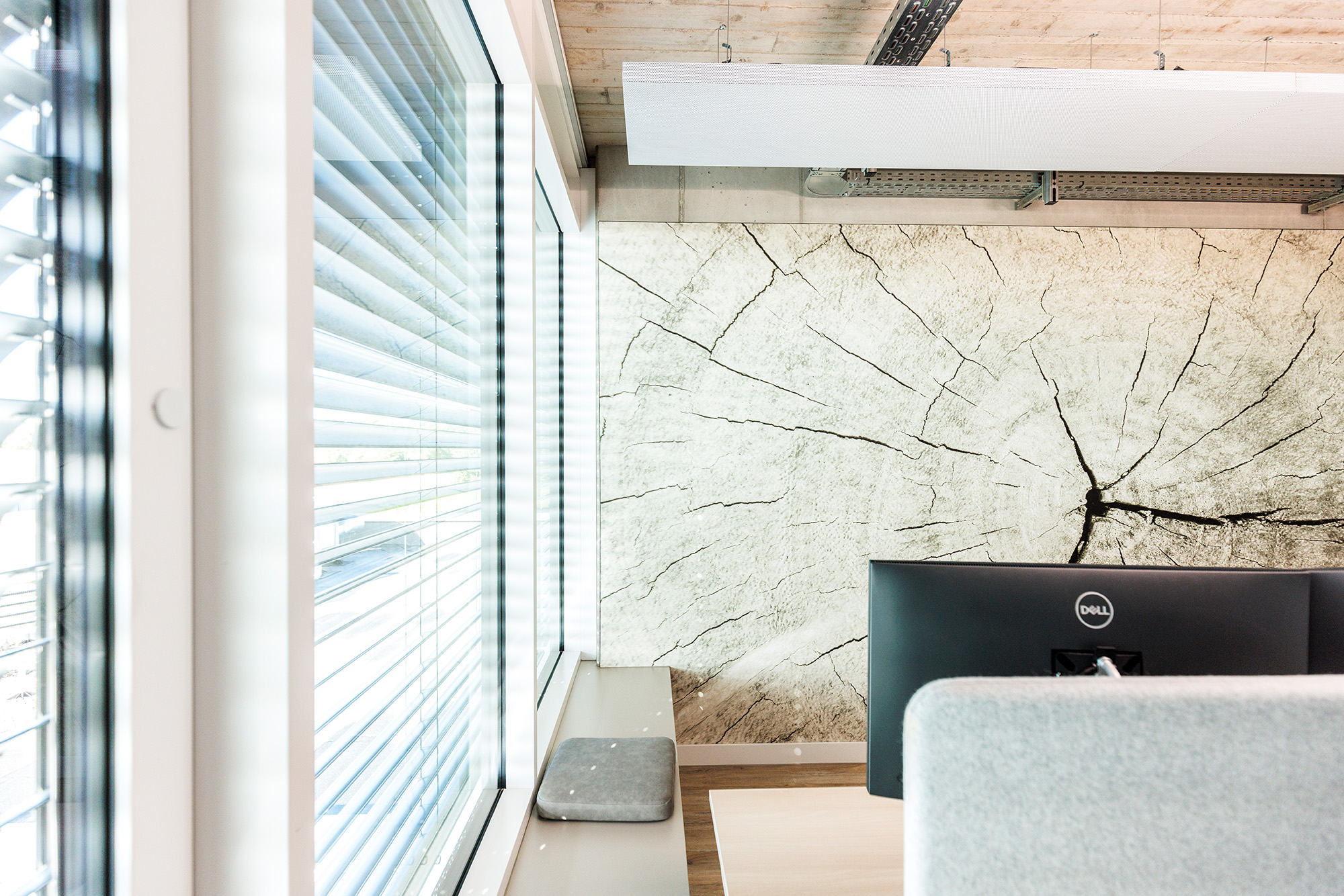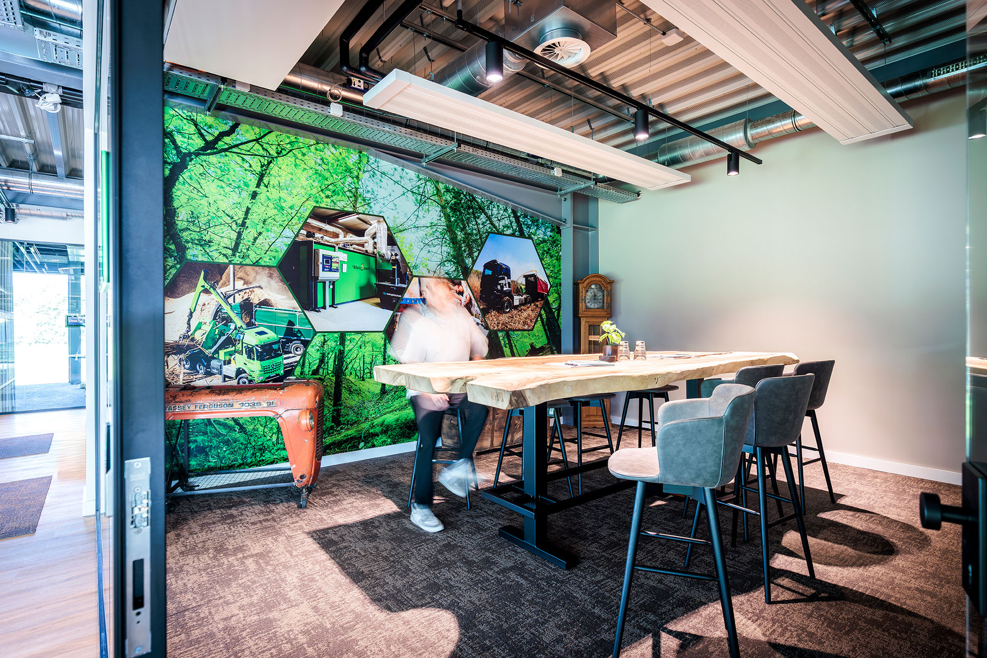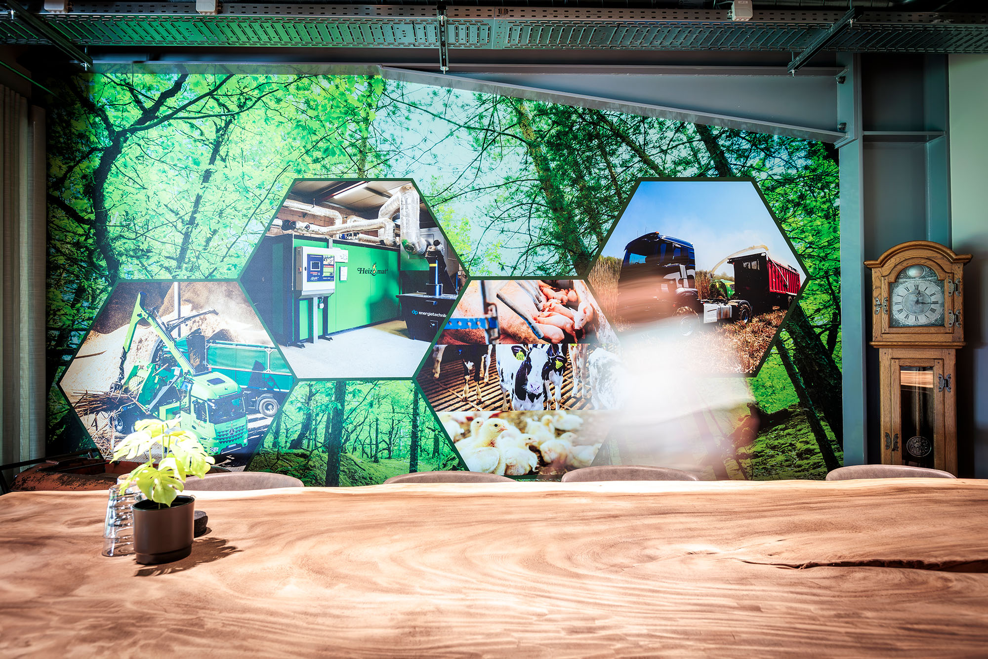 Die Tapetenmotive und auch die Einrichtung sind auf das Unternehmen abgestimmt und unterstreichen die Ausrichtung auf erneuerbare Energiesysteme in Landwirtschaft, Forstwirtschaft, Gewerbe, Industrie und bei Stadtwerken.