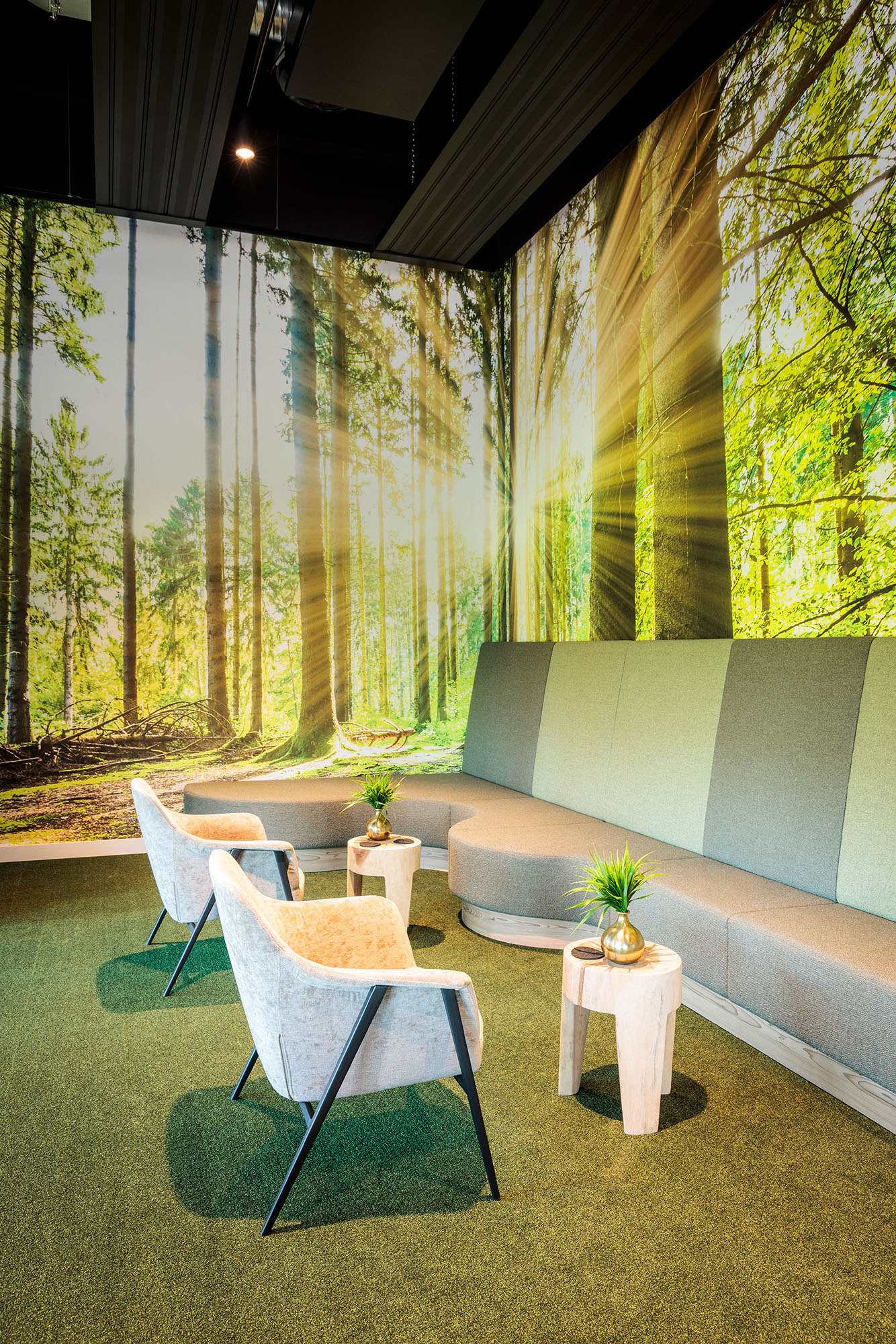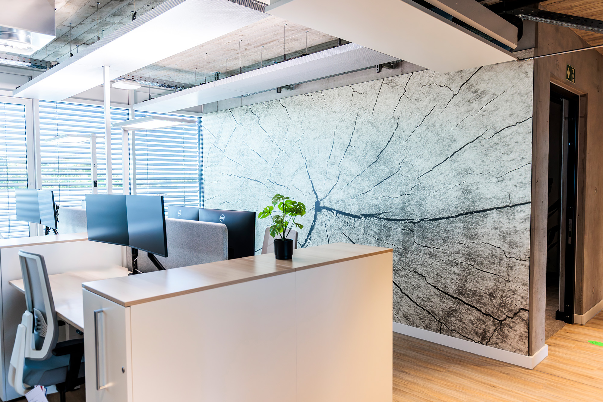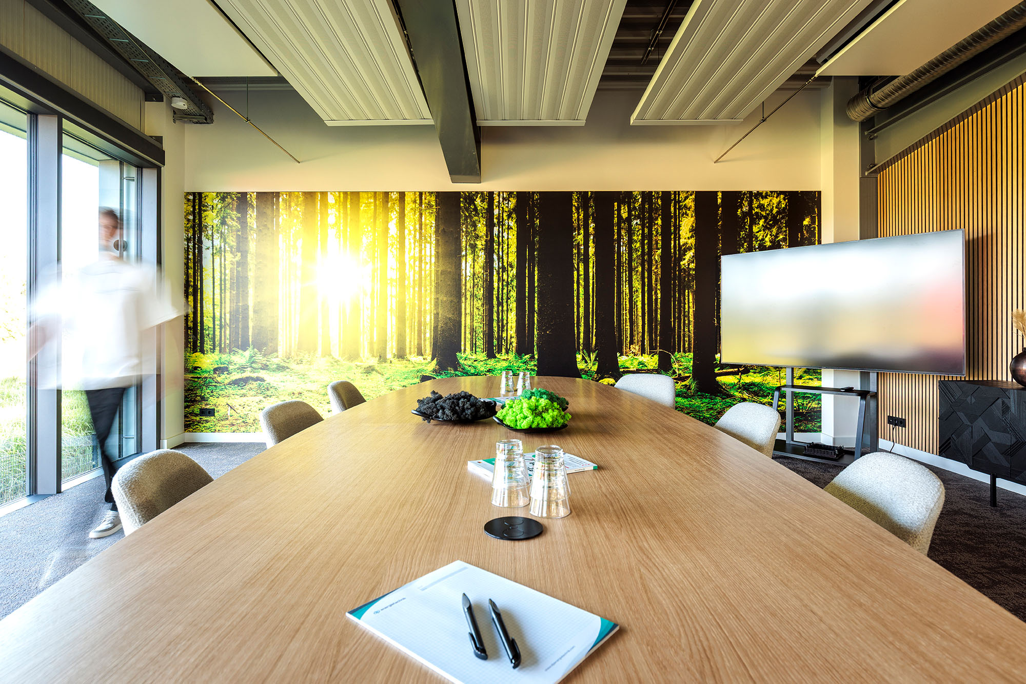 Die Tapetenmotive und auch die Einrichtung sind auf das Unternehmen abgestimmt und unterstreichen die Ausrichtung auf erneuerbare Energiesysteme in Landwirtschaft, Forstwirtschaft, Gewerbe, Industrie und bei Stadtwerken.