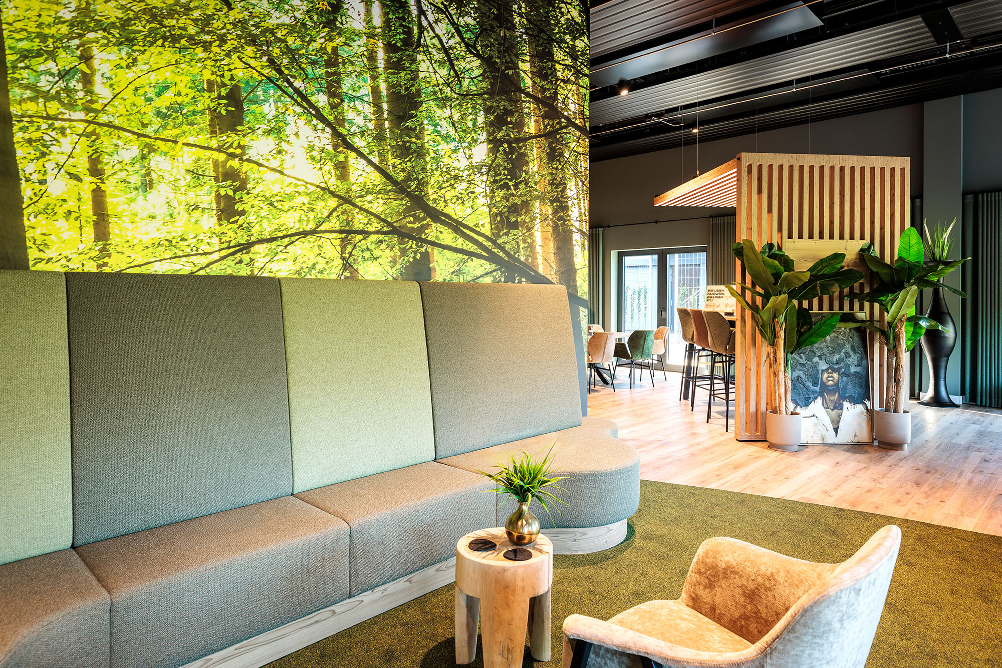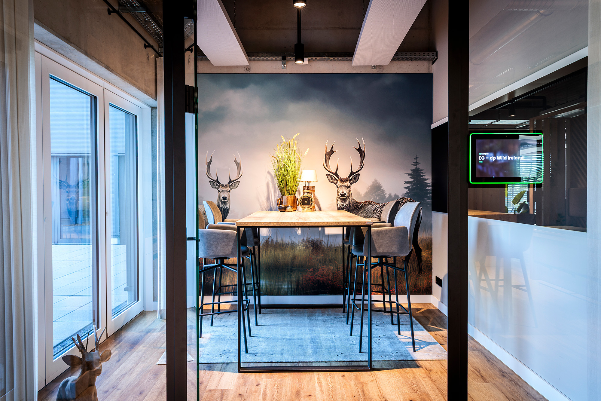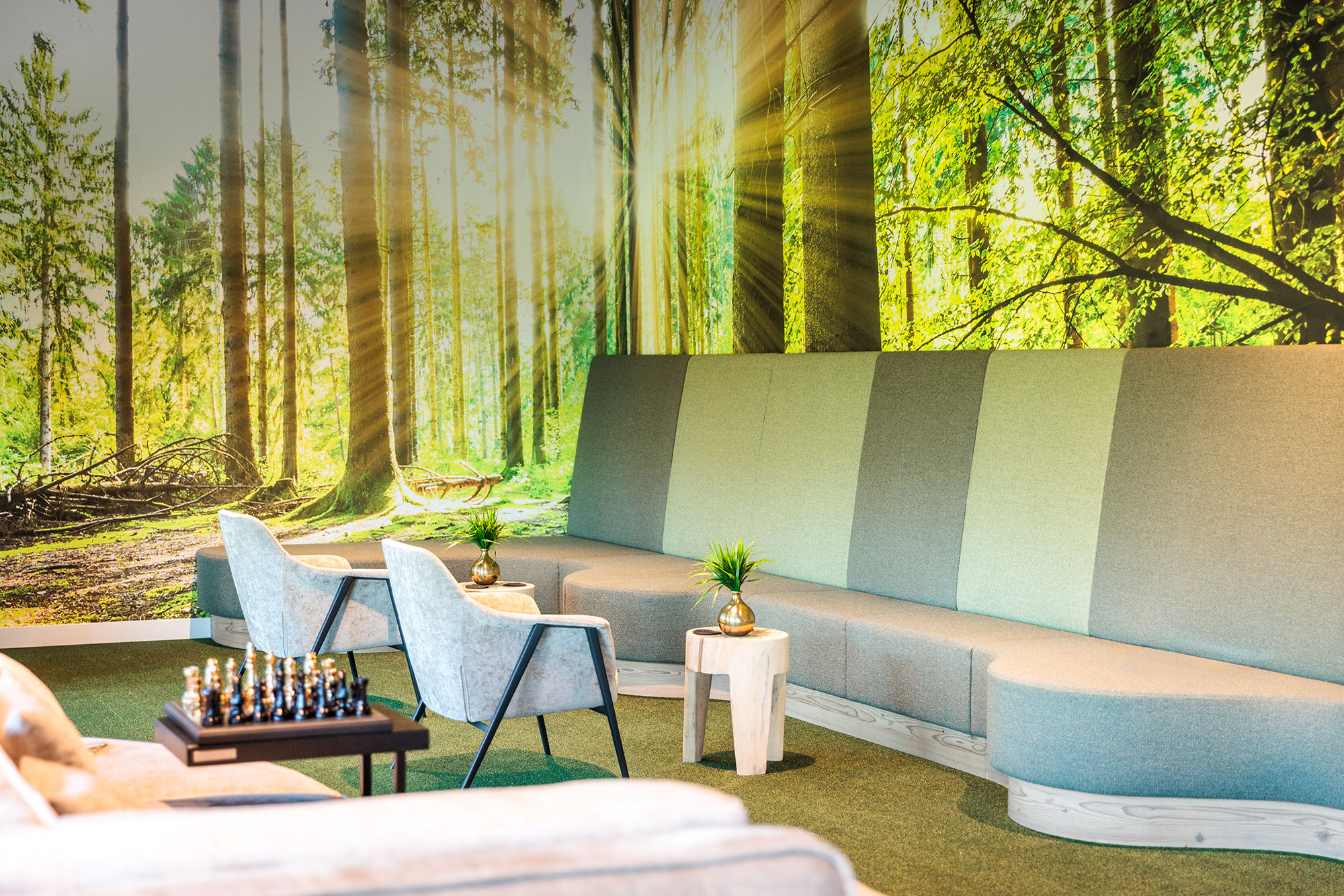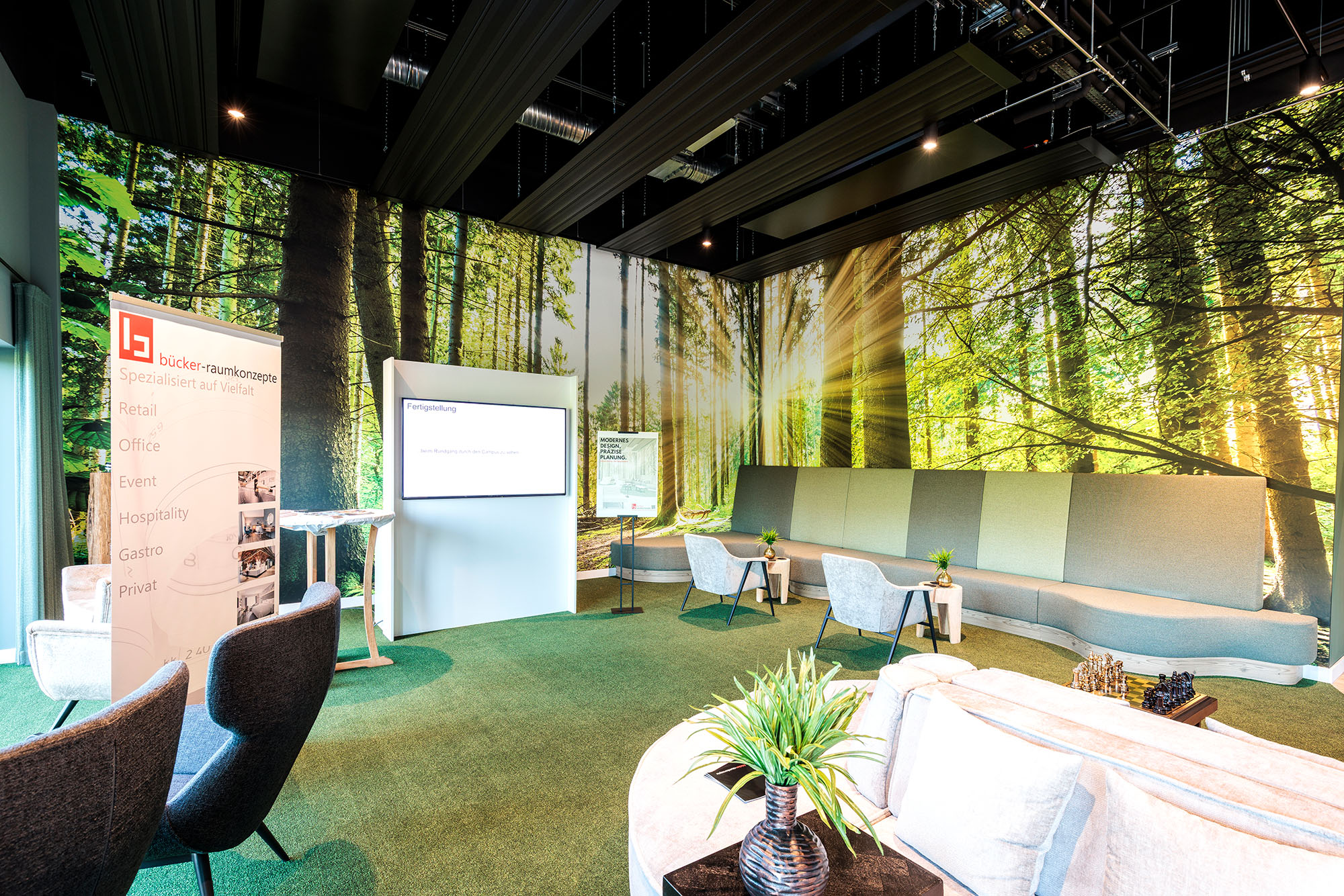 Die Tapetenmotive und auch die Einrichtung sind auf das Unternehmen abgestimmt und unterstreichen die Ausrichtung auf erneuerbare Energiesysteme in Landwirtschaft, Forstwirtschaft, Gewerbe, Industrie und bei Stadtwerken.