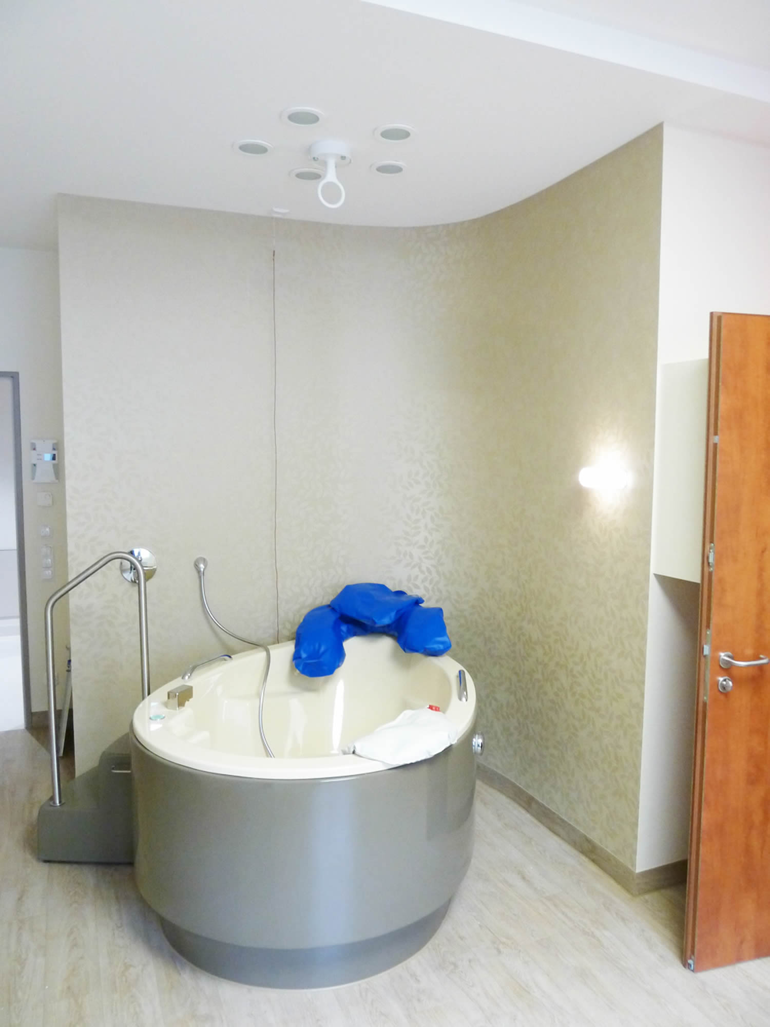 Prägend für das Ergebnis sind die hochwertigen Tapeten in hellen Cremetönen, die besonders im Kreißsaal eine angenehme und ausgeglichene Atmosphäre schaffen. Ergänzt