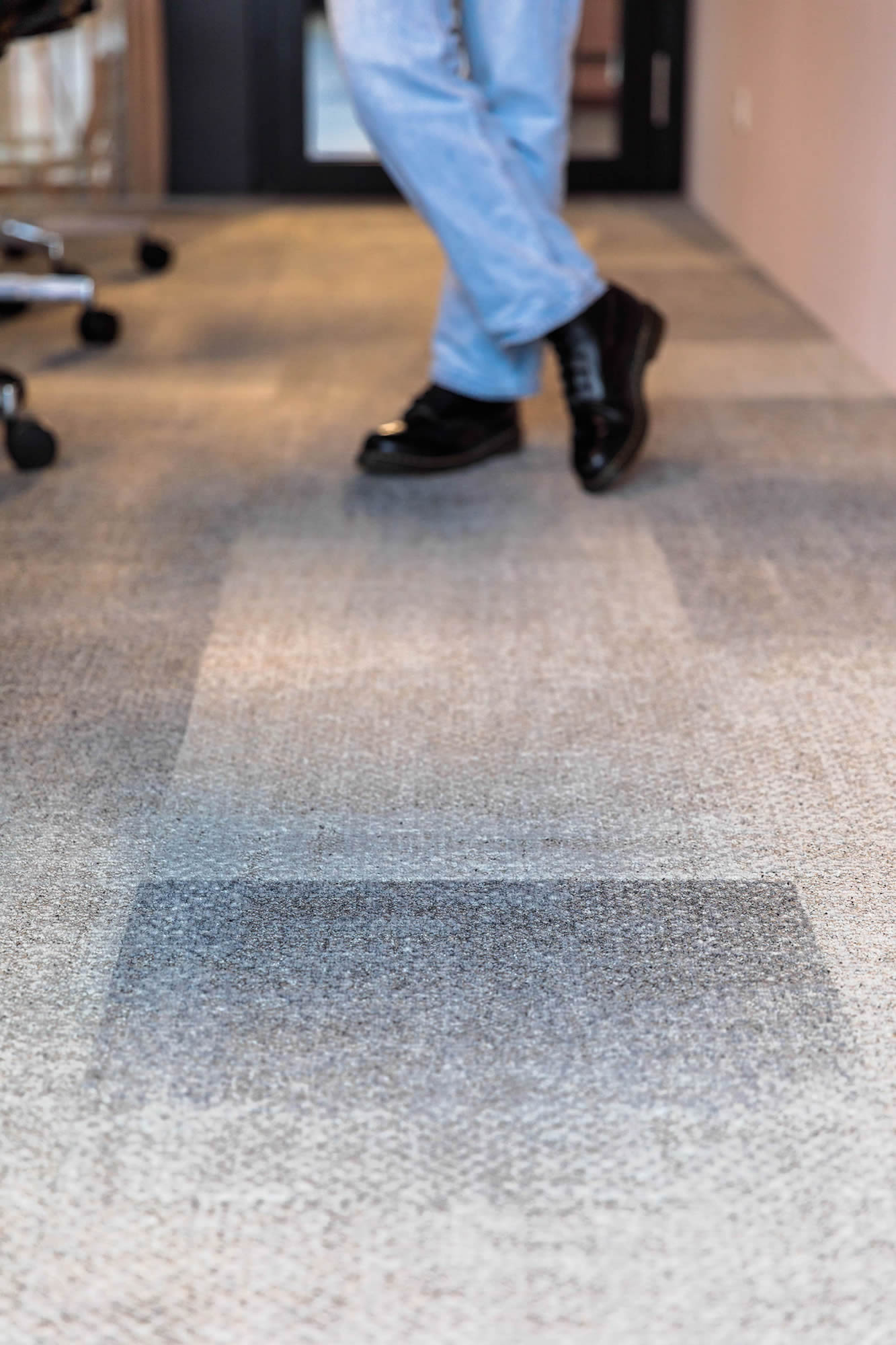 individuelle Fototapeten und Folierungen, die den Büroflächen zusätzliche Struktur und Wiedererkennung geben. Auch im Bereich Boden zeigt sich die Bandbreite des Projekts. Verarbeitet wurden zweifarbige Interface Teppichböden sowie zwei- bis dreifarbige EGE-Teppichböden. Dazu kamen Amtico Designbeläge in klassischer Verlegung und in Fischgrät-Optik. Das vorhandene Parkett wurde aufgearbeitet, abgeschliffen und neu versiegelt. Selbst der robuste Sichtestrich wurde grundgereinigt, neu beschichtet und wieder in einen gepflegten Zustand gebracht. So entsteht eine Arbeitsumgebung, die in allen Bereichen durchdacht wirkt und die unterschiedlichen Nutzungen der Flächen sichtbar unterstützt.