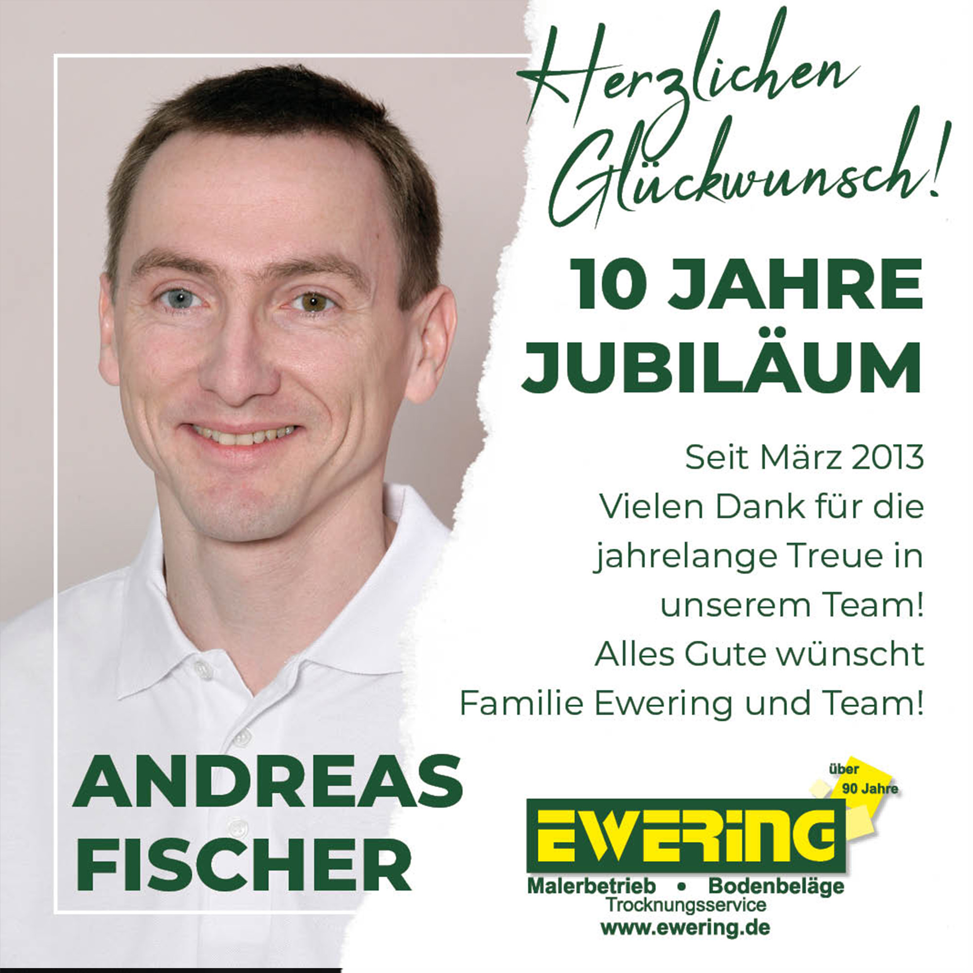 Den Auftakt macht in diesem Jahr unser Standort in Berlin: Andreas Fischer ist seit vielen Jahren ein fester Bestandteil des Teams der Ewering Berlin GmbH und feiert bereits sein 10-jähriges Firmenjubiläum. Mit seinem Engagement und seiner Verlässlichkeit trägt er maßgeblich zum Erfolg unseres Berliner Standorts bei.