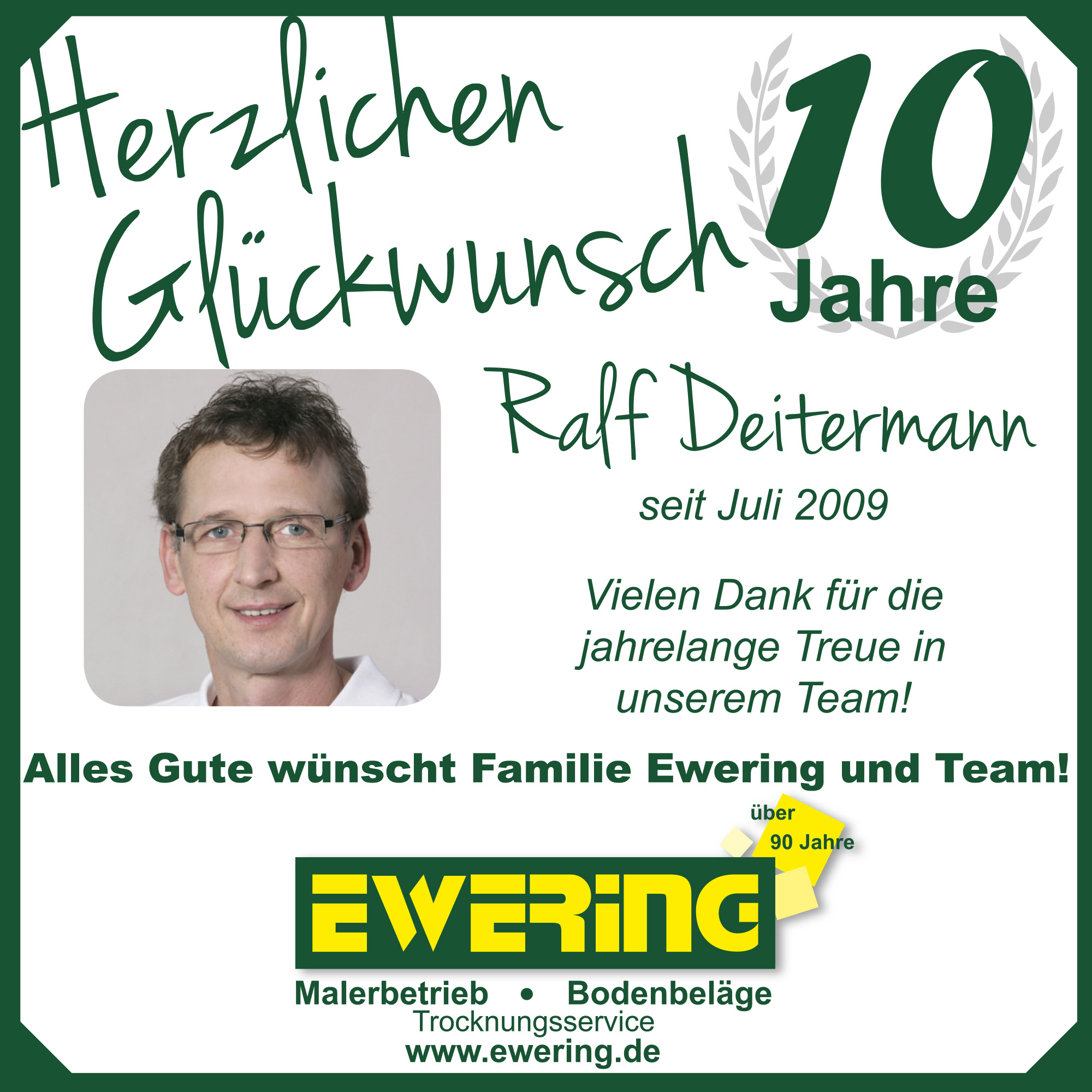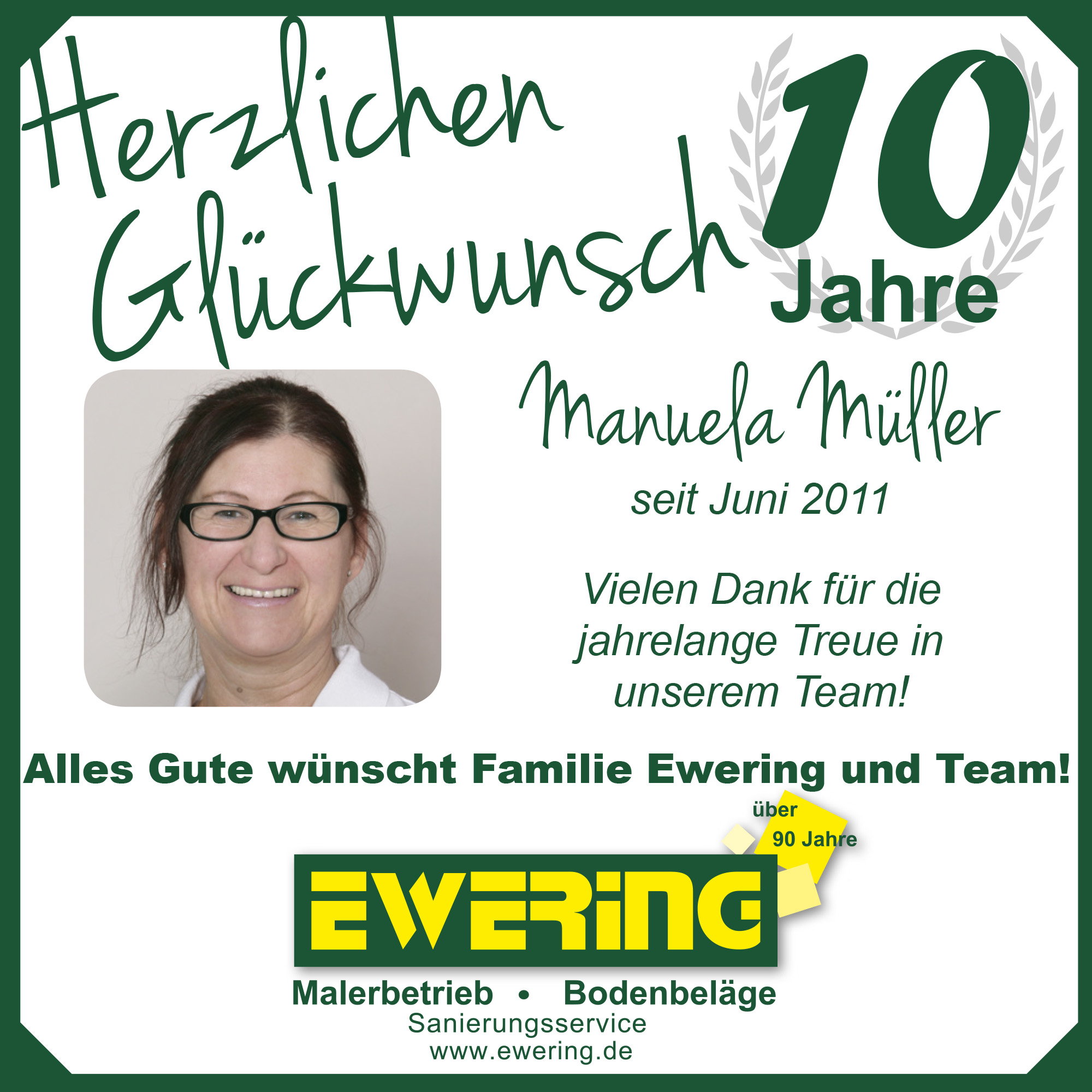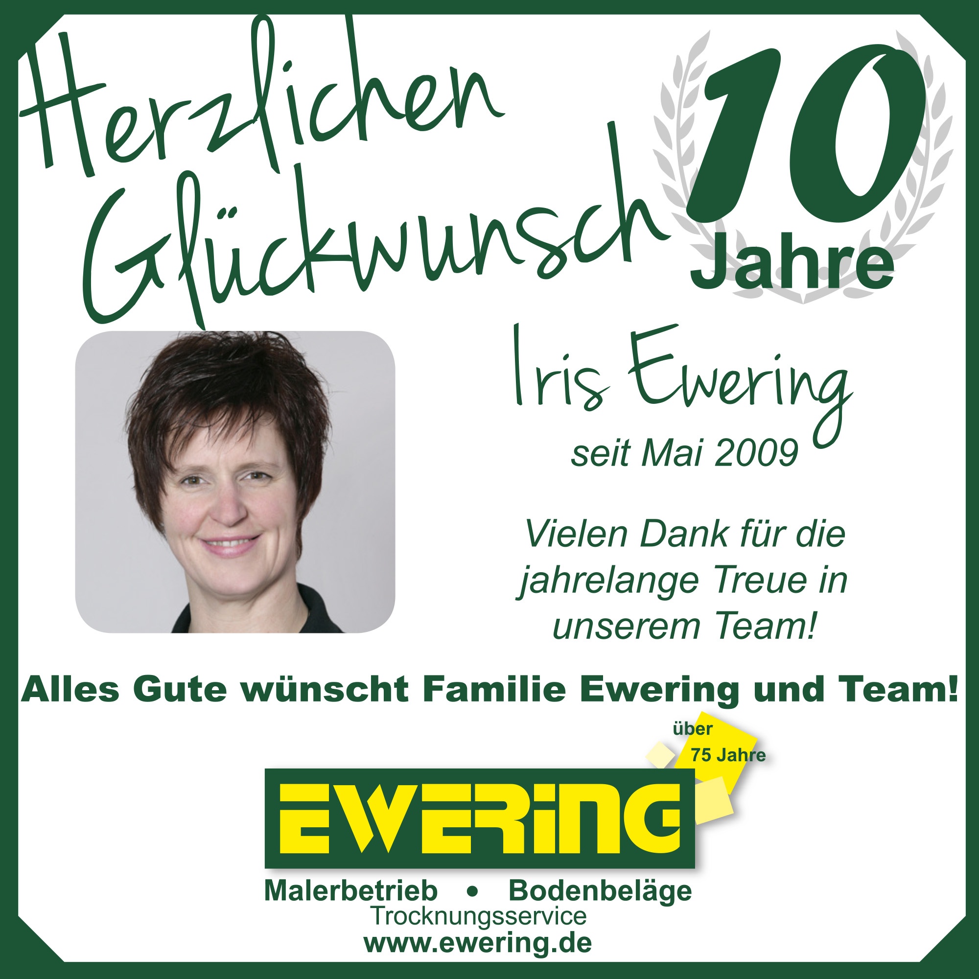 Im Mai feierte unsere Raumausstattermeisterin Iris Ewering ihr 10-jähriges Firmenjubiläum. Mit ihrem Fachwissen und ihrem Einsatz ist sie ein wichtiger Bestandteil unseres Teams. Kurz darauf folgte Ralf Deitermann, der ebenfalls auf 10 Jahre Unternehmenszugehörigkeit als Maler und Lackierer zurückblicken kann.