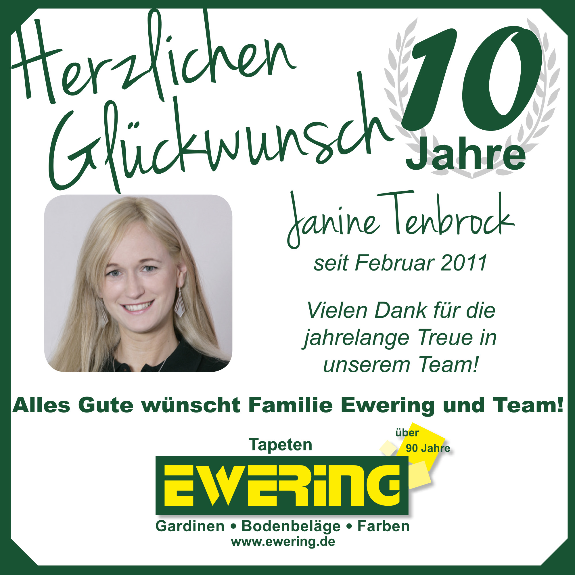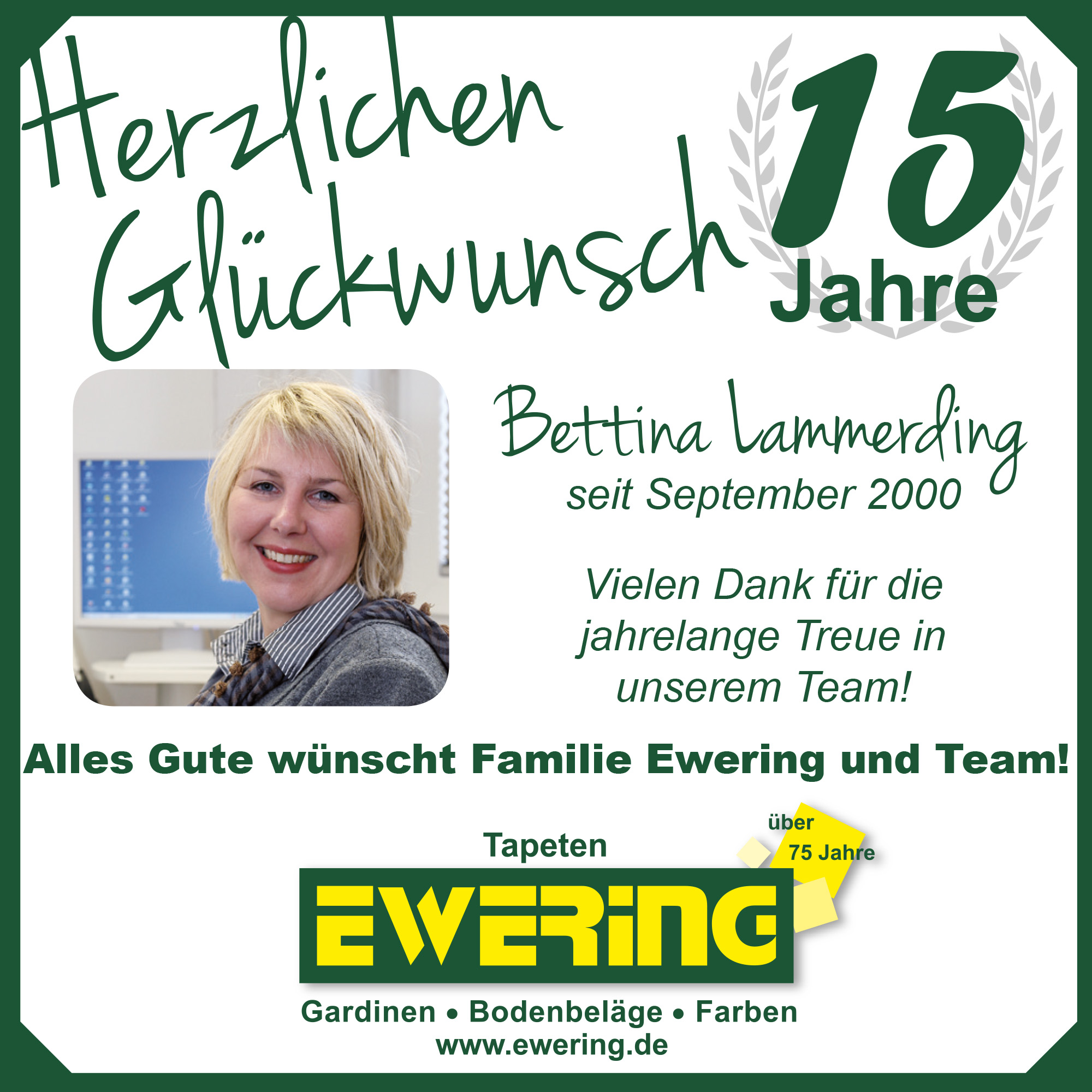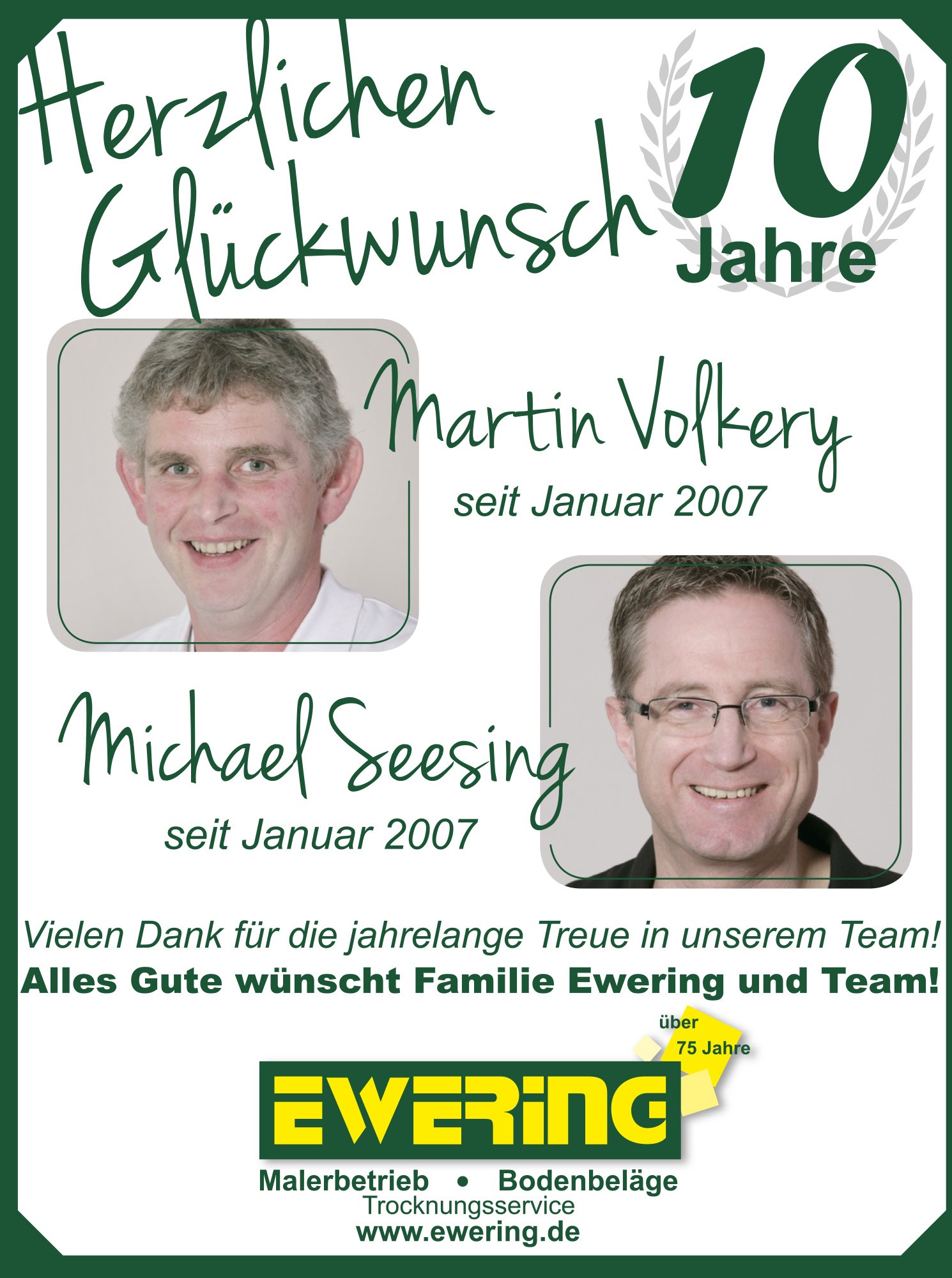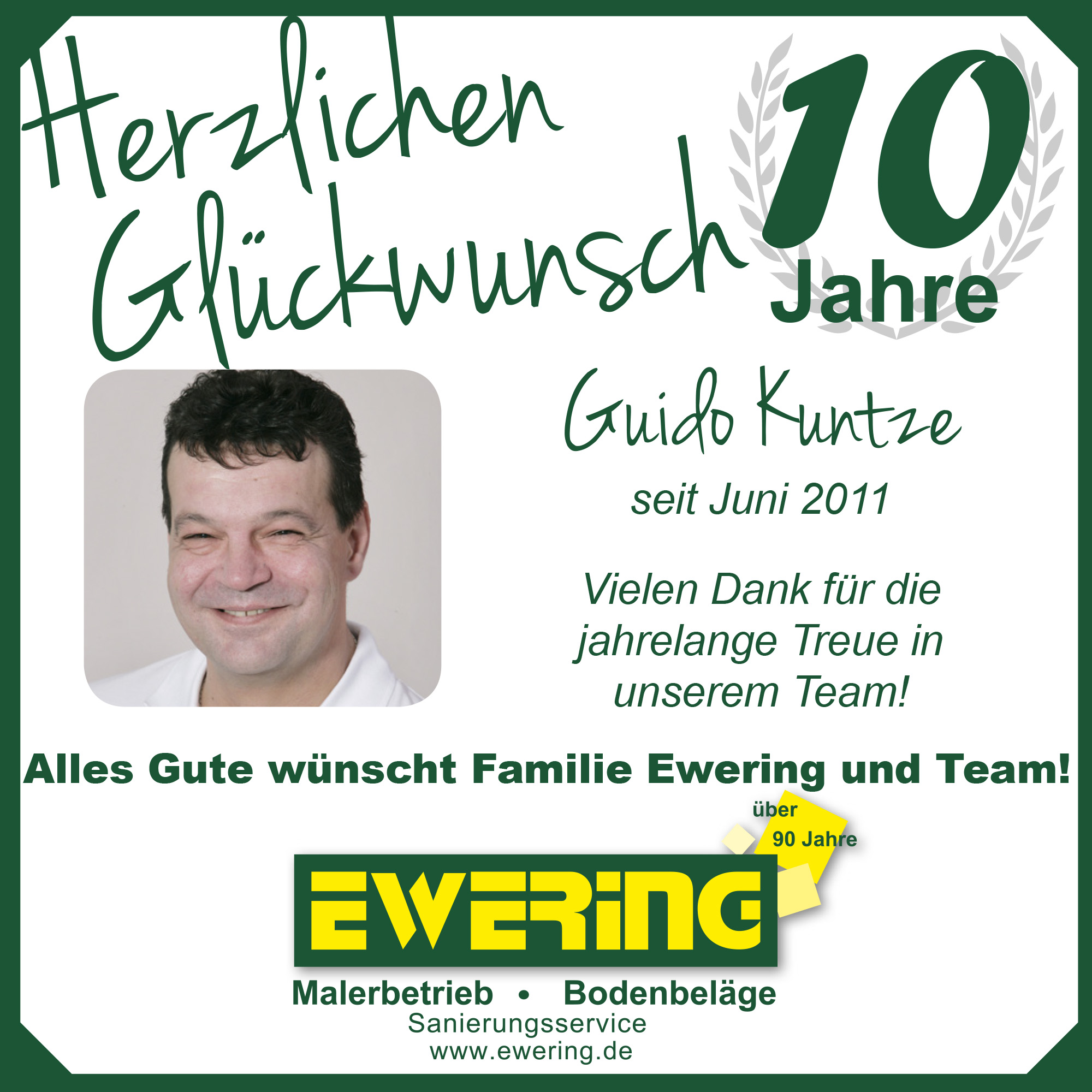 Im Mai feierte unsere Raumausstattermeisterin Iris Ewering ihr 10-jähriges Firmenjubiläum. Mit ihrem Fachwissen und ihrem Einsatz ist sie ein wichtiger Bestandteil unseres Teams. Kurz darauf folgte Ralf Deitermann, der ebenfalls auf 10 Jahre Unternehmenszugehörigkeit als Maler und Lackierer zurückblicken kann.