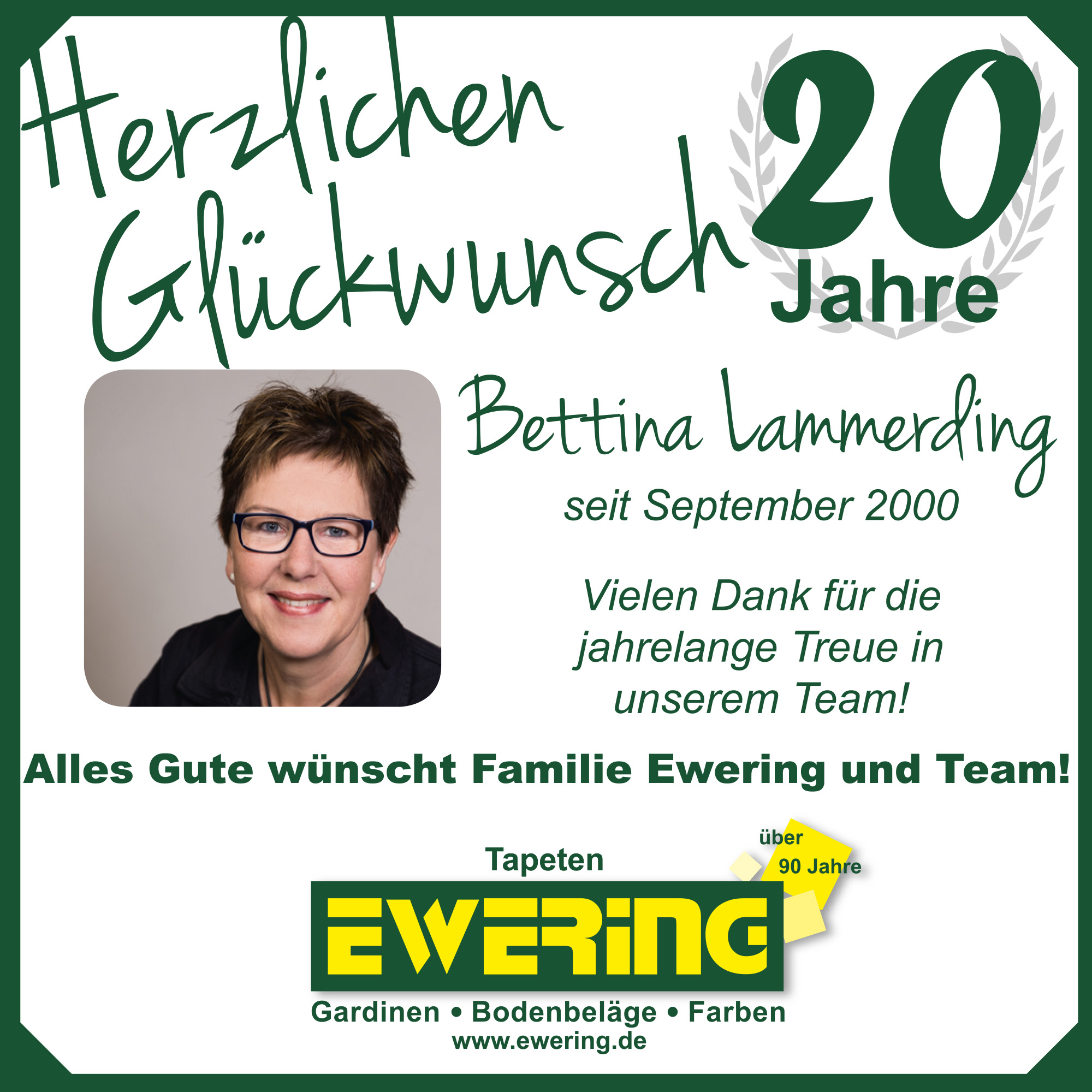 Ein weiteres 20-jähriges Jubiläum begeht Bettina Lammerding, die seit vielen Jahren mit großem Engagement Teil unseres Unternehmens ist. Für ihre langjährige Treue und ihren Einsatz möchten wir uns ganz herzlich bedanken.