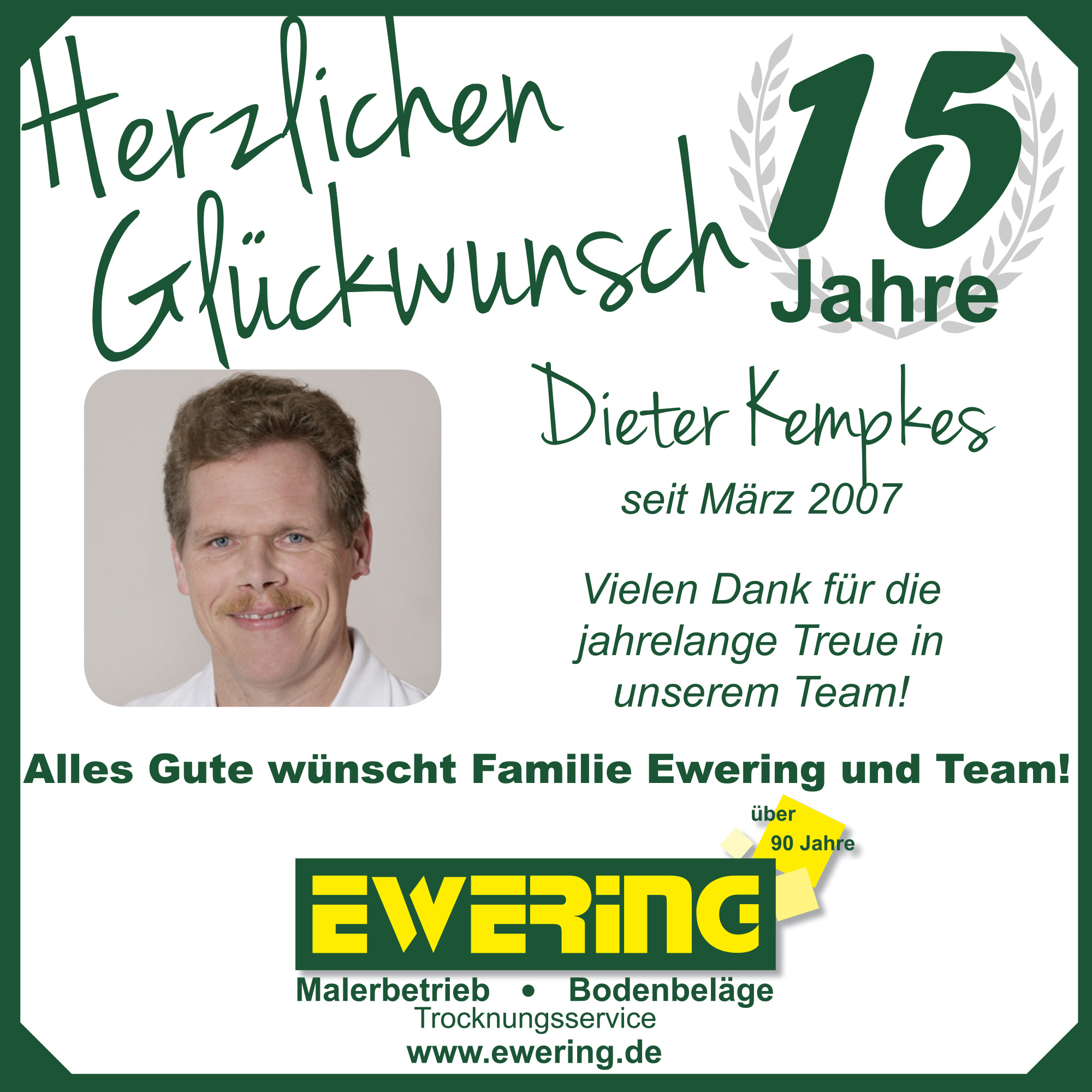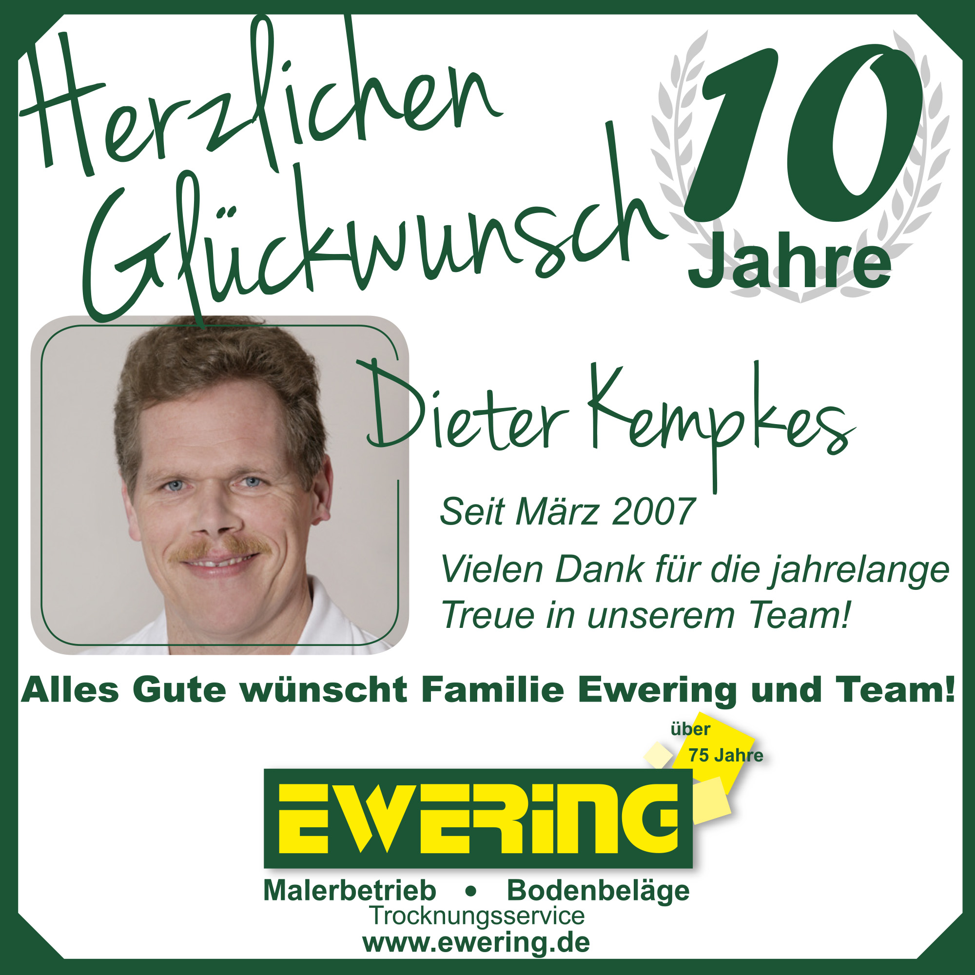 Im März 2007 verstärkte Dieter Kempkes unser Team der Ewering GmbH. Auch er blickt mittlerweile auf 10 Jahre Betriebszugehörigkeit zurück und ist aus unserem Unternehmen nicht mehr wegzudenken.