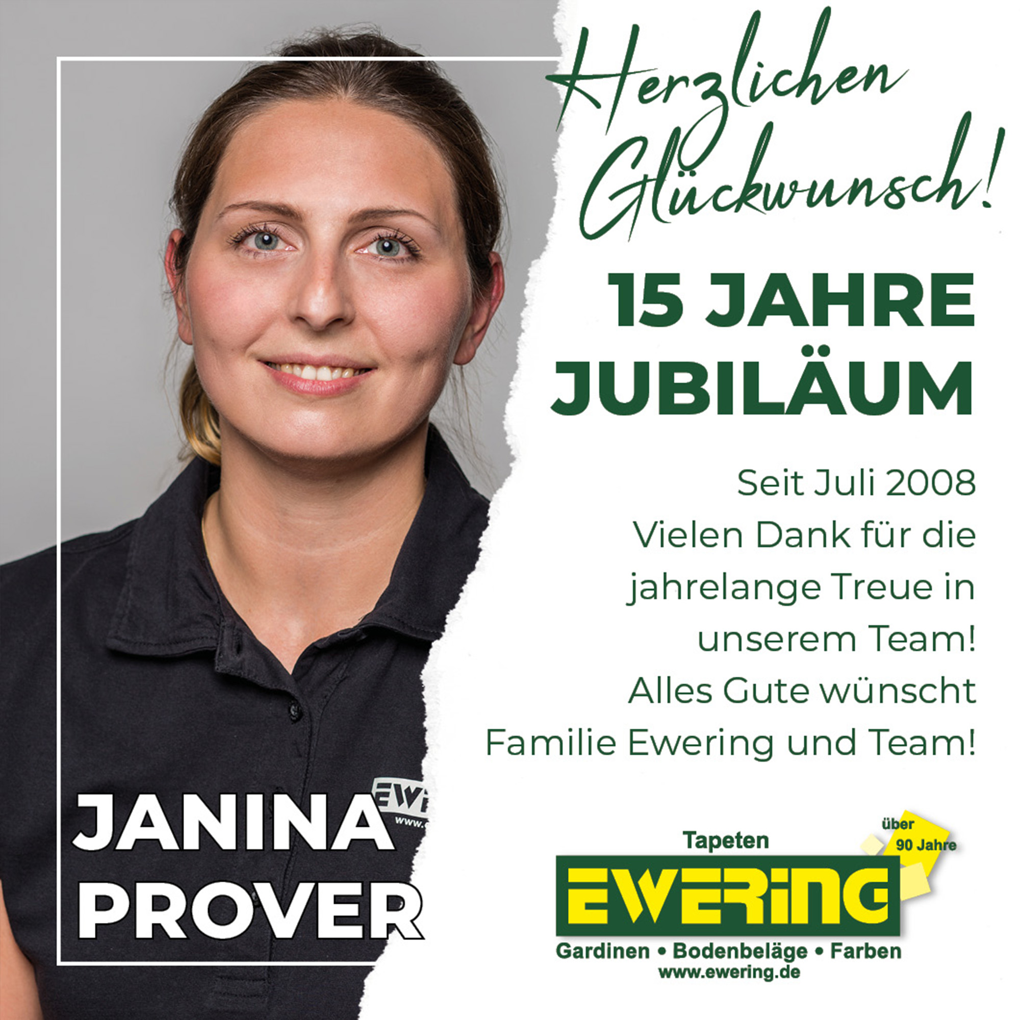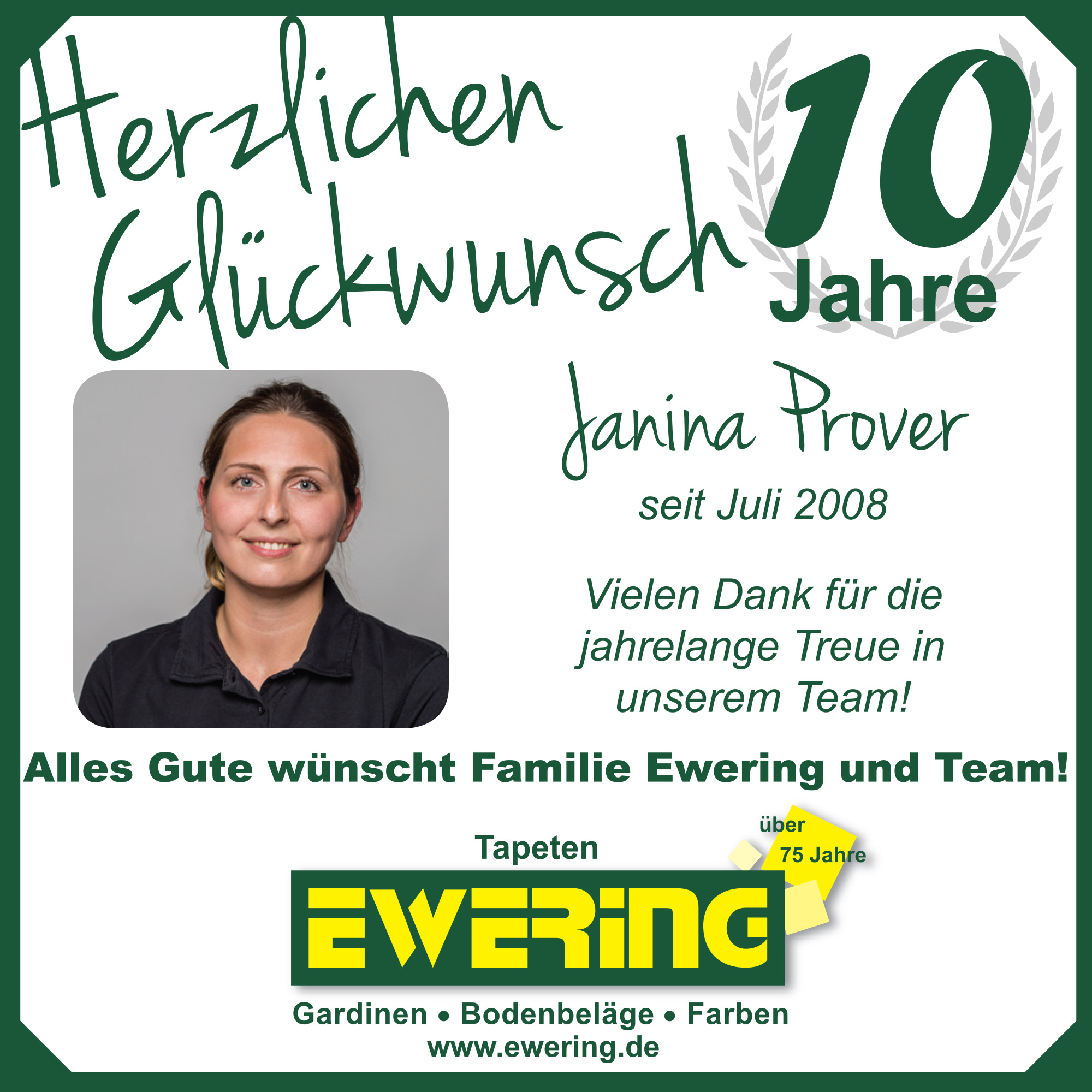 Ebenfalls auf 10 Jahre Betriebszugehörigkeit blickt Janina Prover zurück. Im Juli 2008 begann sie ihre Ausbildung zur Mediengestalterin in unserem Unternehmen und hat sich seitdem zu einem festen und geschätzten Mitglied unseres Teams entwickelt.