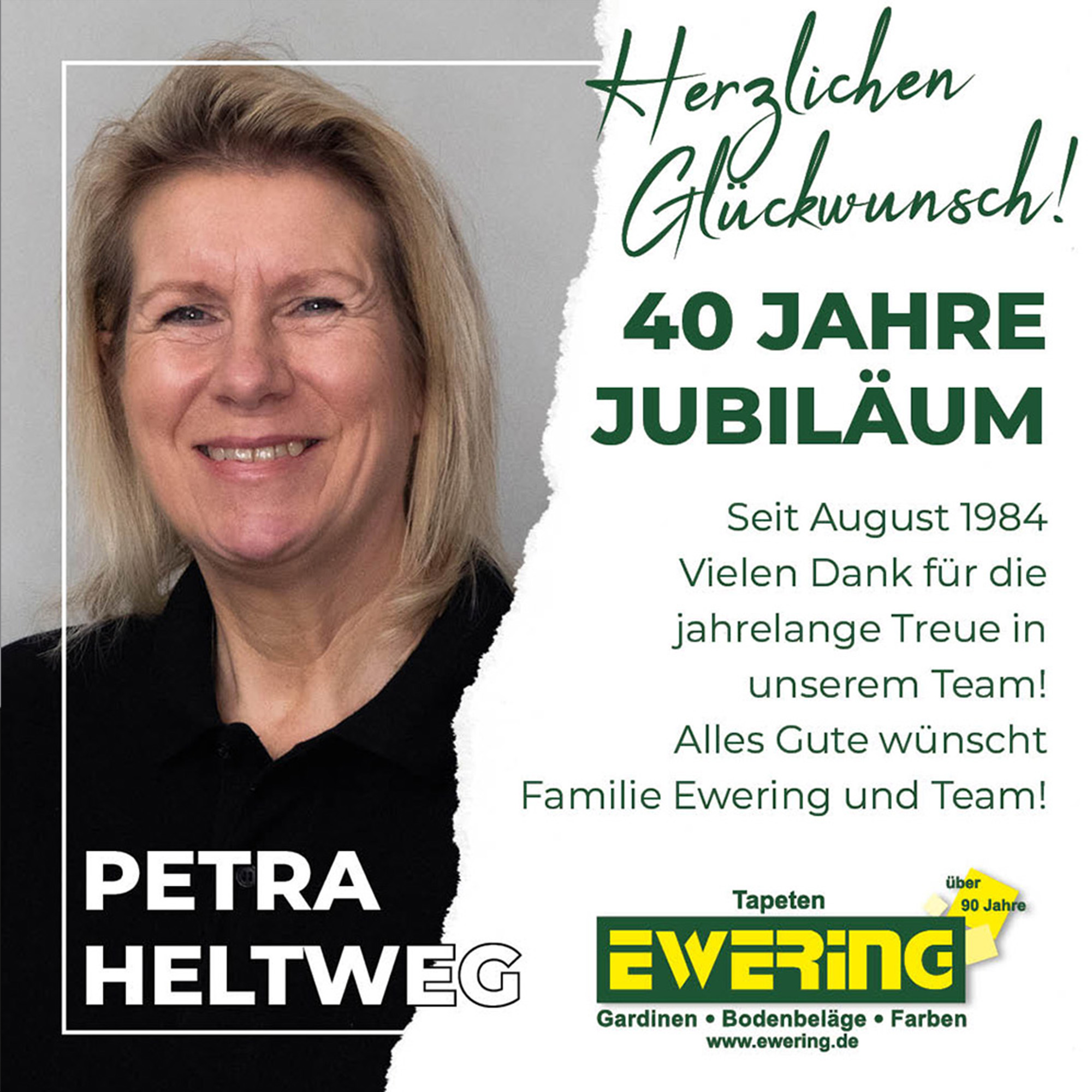 Ein weiteres bemerkenswertes Jubiläum begeht Petra Heltweg, die unser Unternehmen bereits seit ihrer Ausbildung begleitet. Mit 40 Jahren Betriebszugehörigkeit steht sie für außergewöhnliche Loyalität und langjähriges Engagement – eine beeindruckende Leistung, für die wir ihr ganz besonders danken.