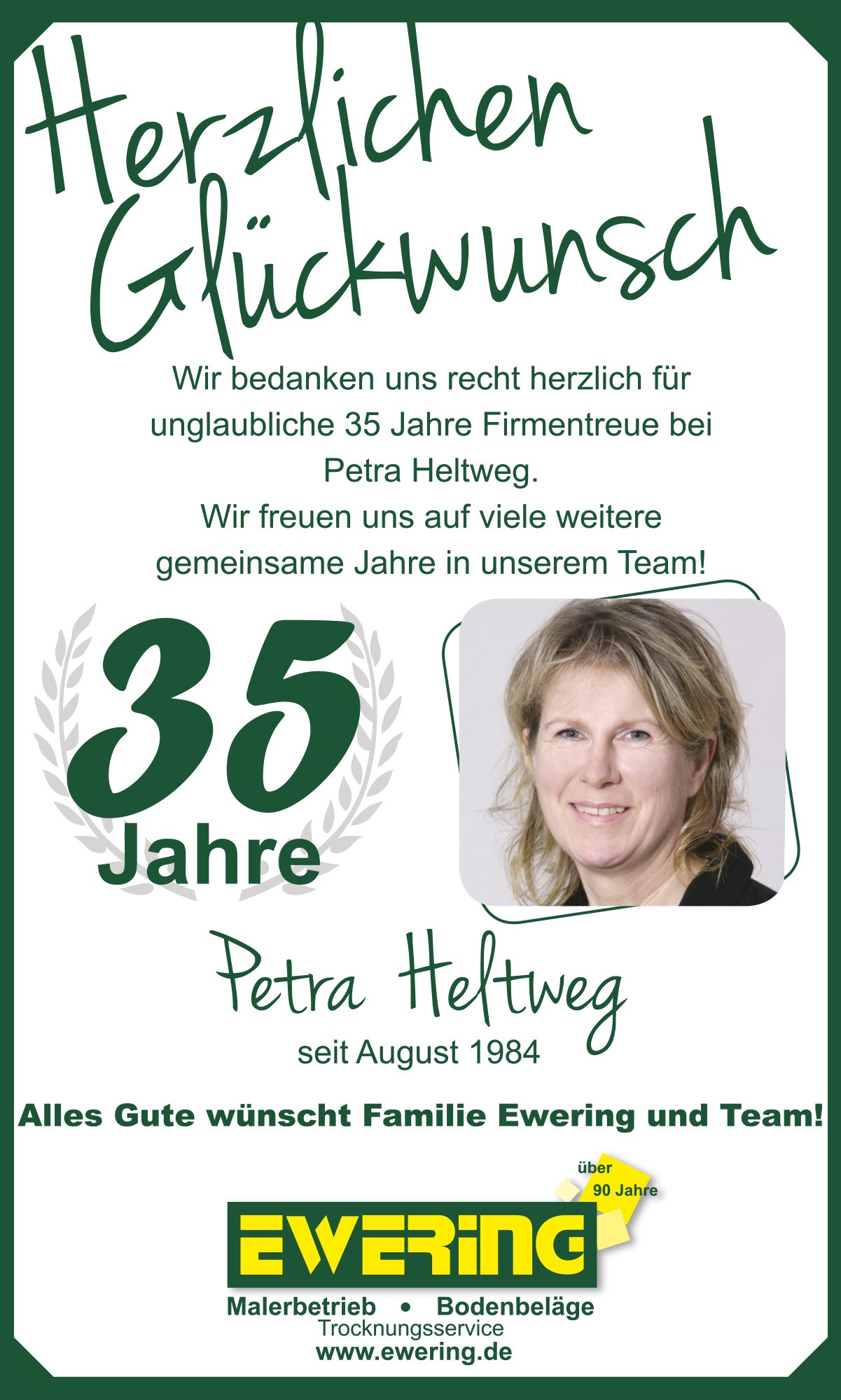 Ein ganz besonderes Jubiläum feierte Petra Heltweg, die auf beeindruckende 35 Jahre Betriebszugehörigkeit zurückblicken kann. Seit vielen Jahren bereichert sie unser Fachmarkt-Team mit ihrer Erfahrung und ihrem Einsatz.