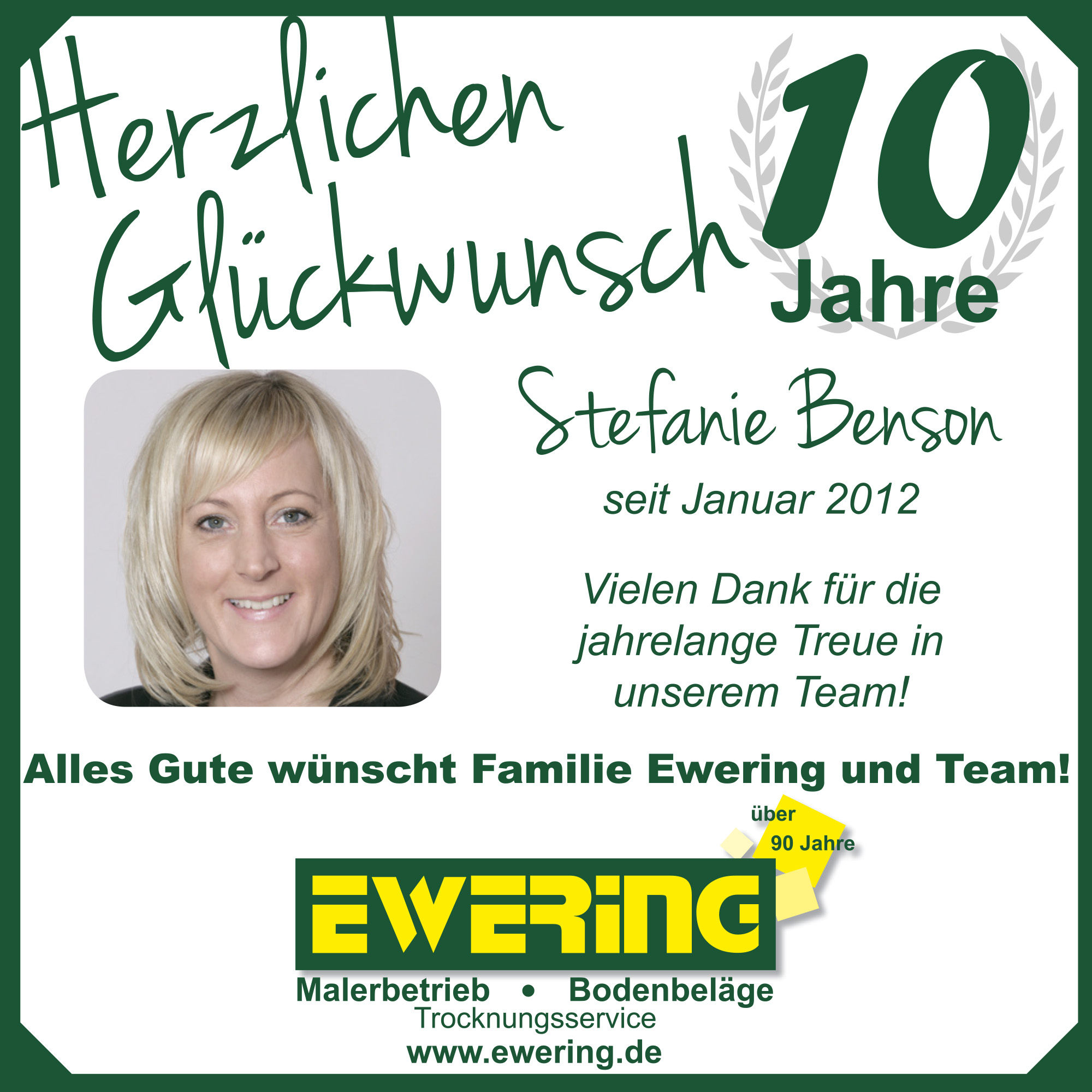 Wir gratulieren Stefanie Benson herzlich zu ihrem 10-jährigen Firmenjubiläum. Seit einem Jahrzehnt ist sie ein wertvoller Teil unseres Teams und trägt mit ihrem Engagement und ihrer Zuverlässigkeit maßgeblich zum gemeinsamen Erfolg bei.