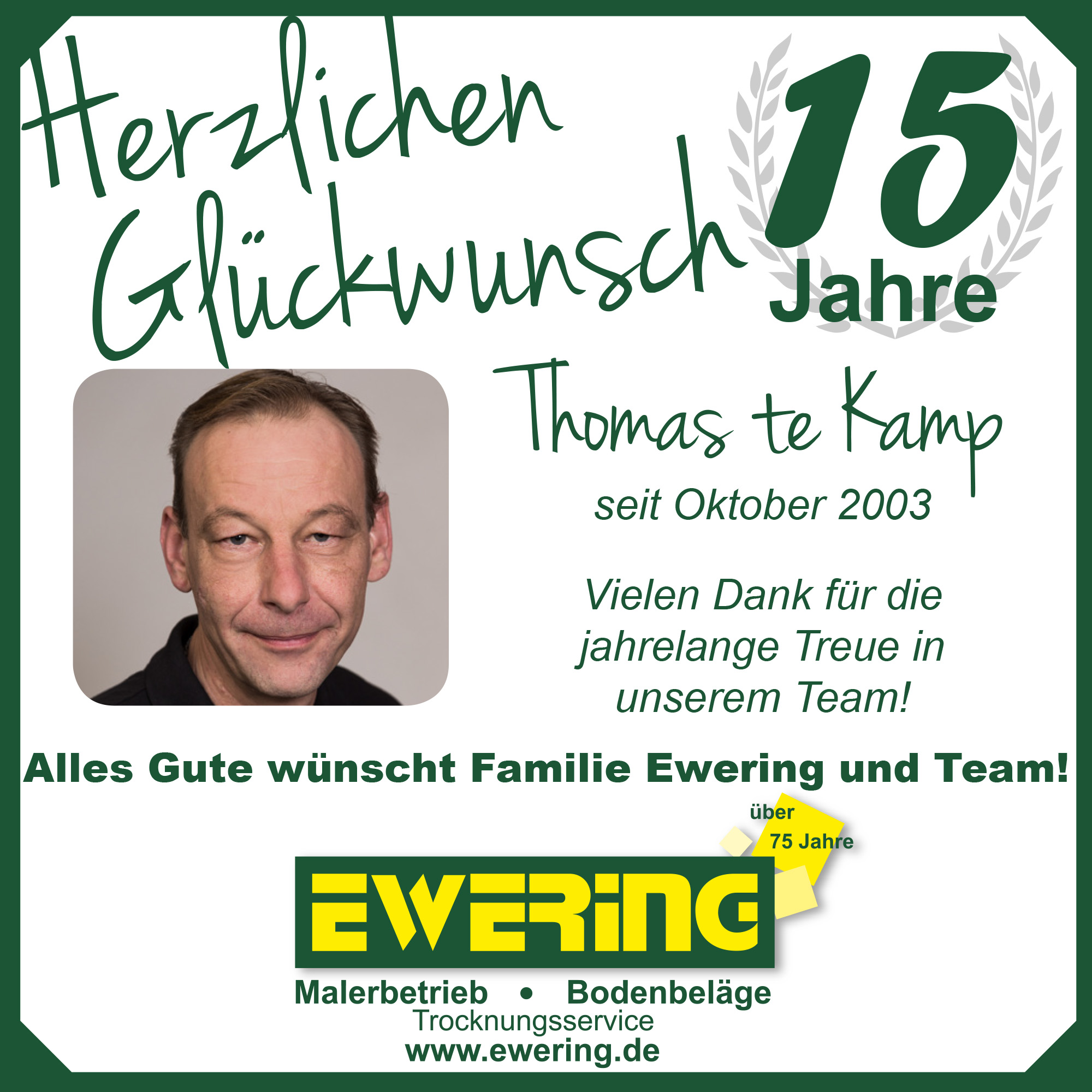 Ein weiteres beeindruckendes Jubiläum feiert unser Bauleiter Thomas te Kamp, der unser Team der Ewering GmbH bereits seit Oktober 2003 unterstützt. Mit seiner langjährigen Erfahrung und seinem Engagement ist er ein wichtiger Bestandteil unseres Unternehmens.