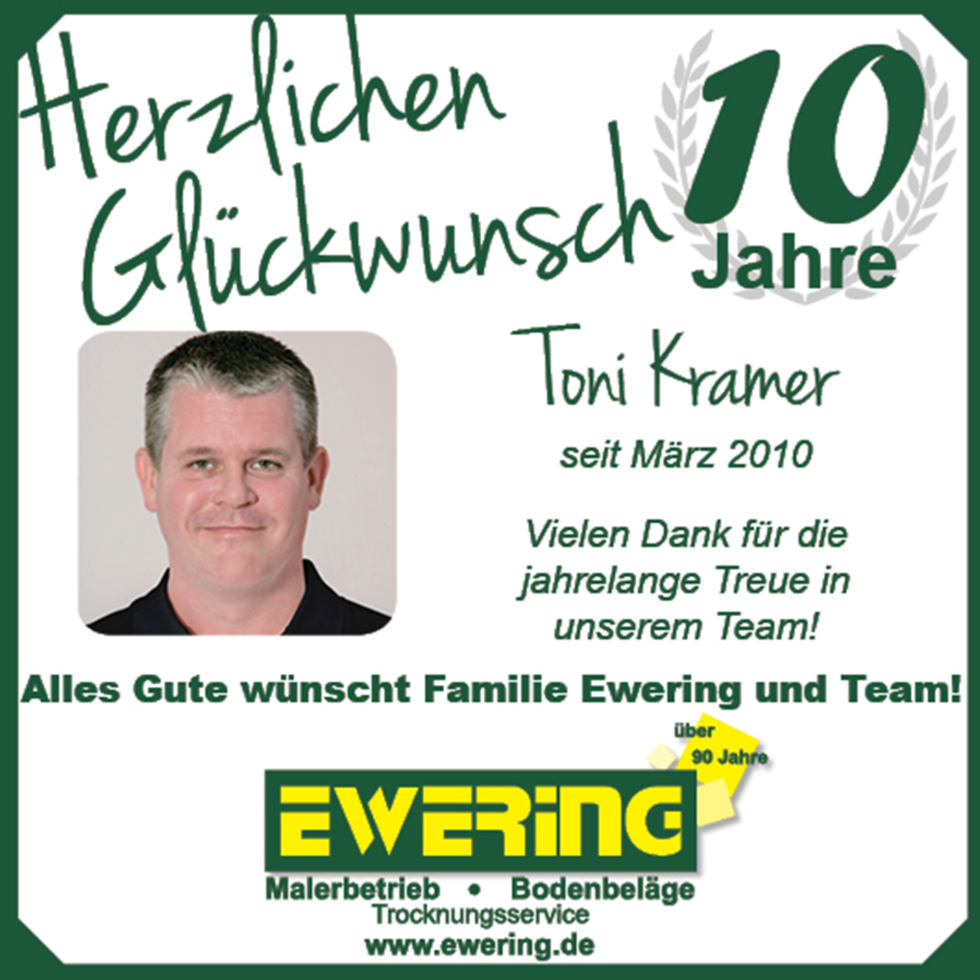 Ebenfalls ein rundes Jubiläum feiert Toni Kramer, der vor 10 Jahren seinen ersten Arbeitstag bei der Ewering Berlin GmbH antrat. Inzwischen ist er ein fester Bestandteil unseres Teams und aus dem Arbeitsalltag nicht mehr wegzudenken. Wir freuen uns sehr auf die weitere gemeinsame Zusammenarbeit.