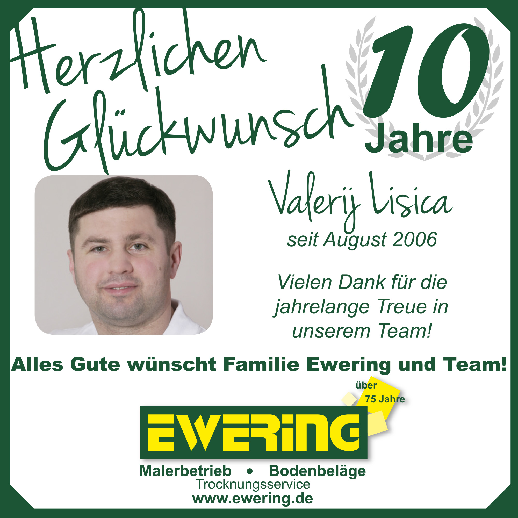 Ein weiteres Jubiläum konnten wir im Jahr 2016 mit Valerij Lisica feiern. Im August 2006 begann er seine Ausbildung in unserem Unternehmen und ist seitdem ein fester Bestandteil des Teams der Ewering GmbH. Mit seinem handwerklichen Können und seinem Einsatz hat er sich über die Jahre hinweg zu einem wichtigen Mitglied unseres Teams entwickelt. In diesem Jahr blickt er auf 10 Jahre Betriebszugehörigkeit zurück.